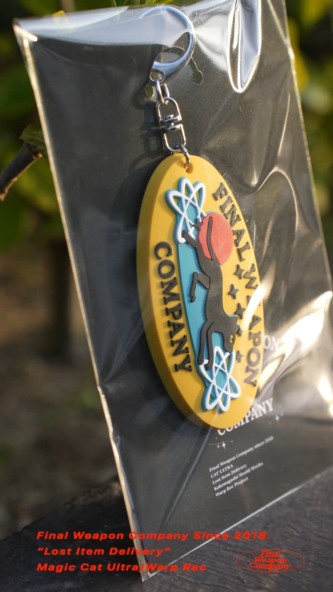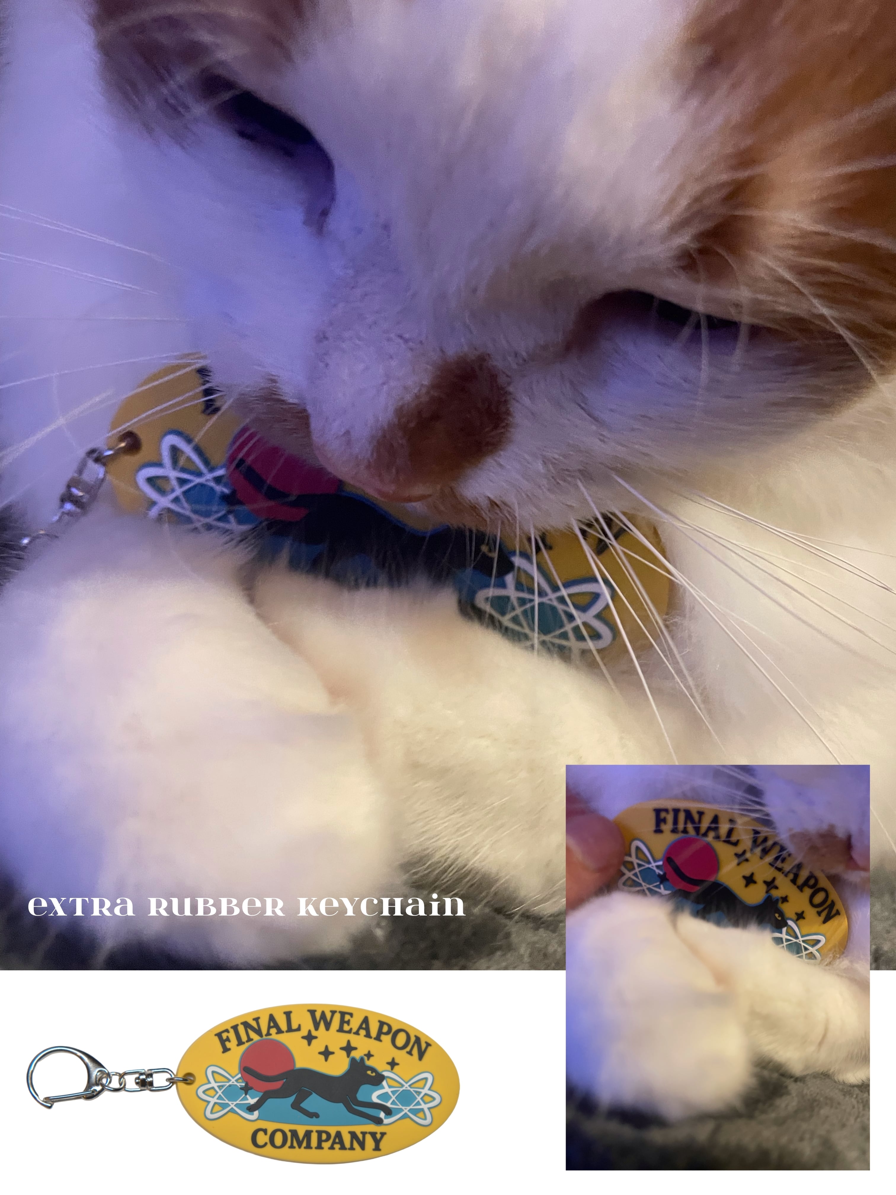 ■原子構造のモチーフの間に挟まれたFWC猫デザインのラバーキーホルダーになります。